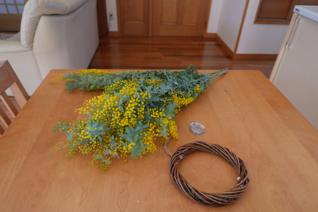 切り花を飾る習慣もなかったし、買って帰ろうなんて思った事もなかったのですが、季節を楽しむお友達から「一緒にリースを作ろう」と誘ってもらって、初めてミモザを購入しました。
